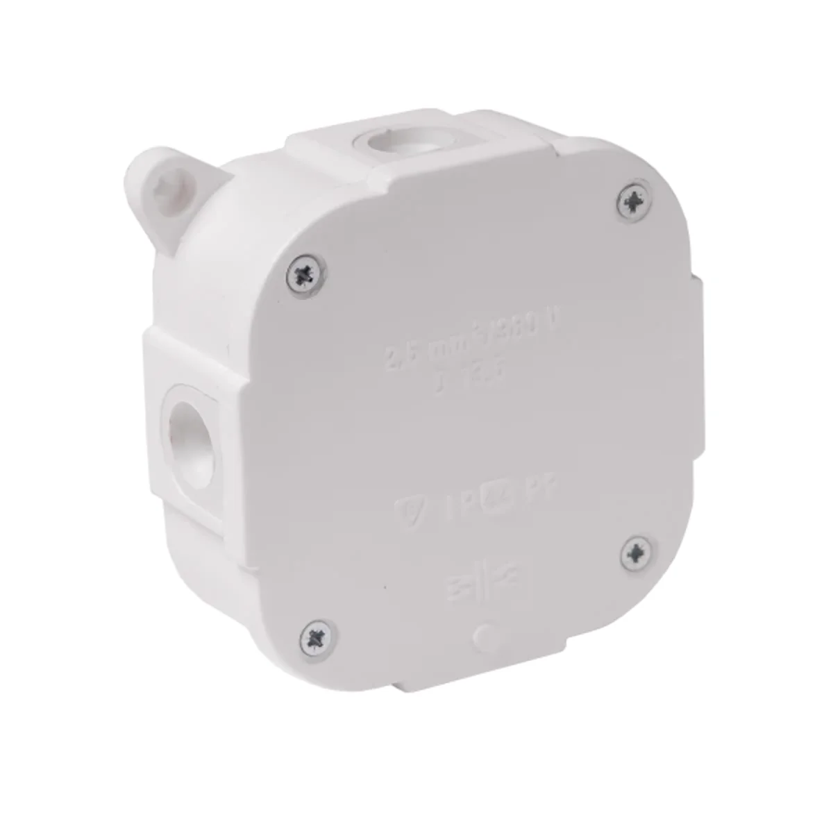 Scatola da parete, dimensioni 88x88x40mm, con protezione IP44, 4 ingressi con depotenziatore; è possibile utilizzare pressacavi filettati. E' dotato di coperchio con 4 viti. In bianco.