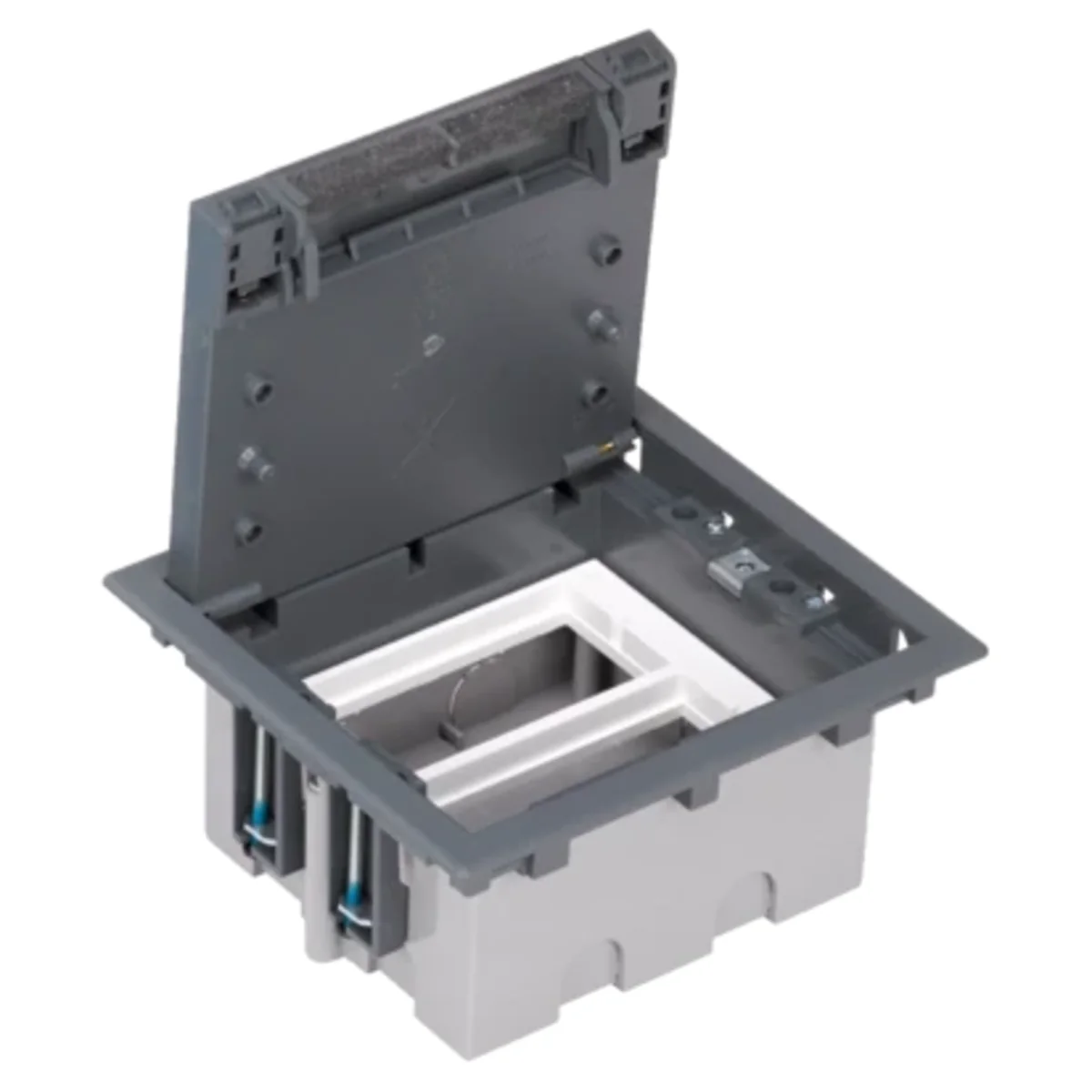 Le installazioni sotto pavimento rappresentano attualmente lo standard per gli impianti elettrici e di telecomunicazione nei moderni luoghi di lavoro. L'utilizzo delle scatole da pavimento della serie SF consente un accesso semplice e veloce ai media in luoghi lontani dalle pareti.