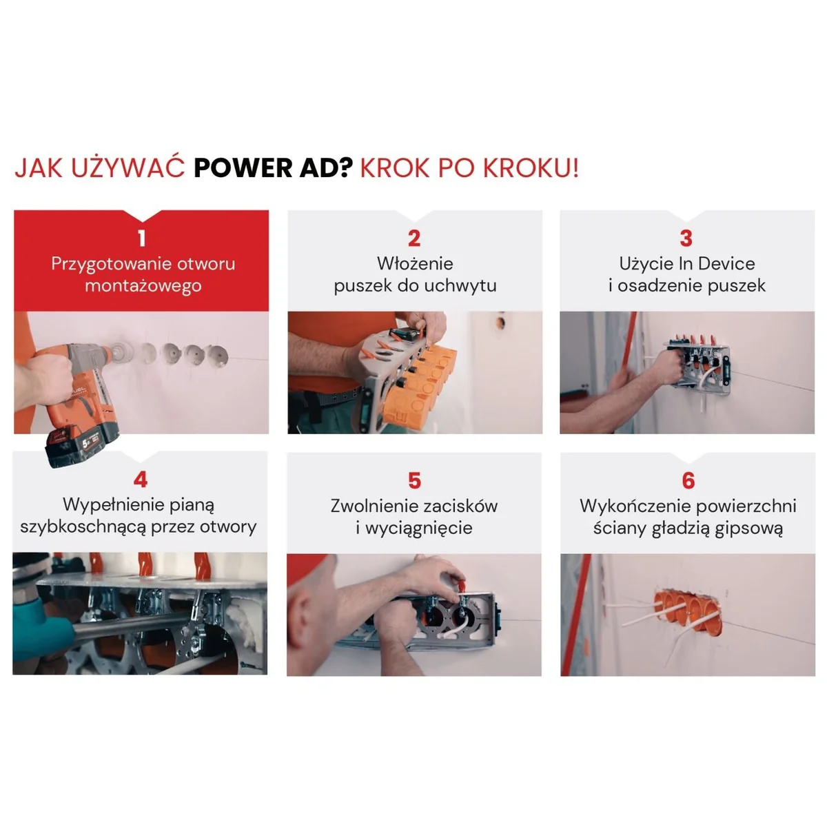 Il dispositivo è uno strumento innovativo per scatole da incasso tipo PK60 con diametro di 60 mm. Lo strumento è destinato agli appaltatori di impianti elettrici nel settore edile. È disponibile in un set di quattro lunghezze che facilitano l'installazione in fila di due, tre, quattro o cinque scatole, garantendo la dimensione perfetta per il montaggio dell'apparecchiatura.