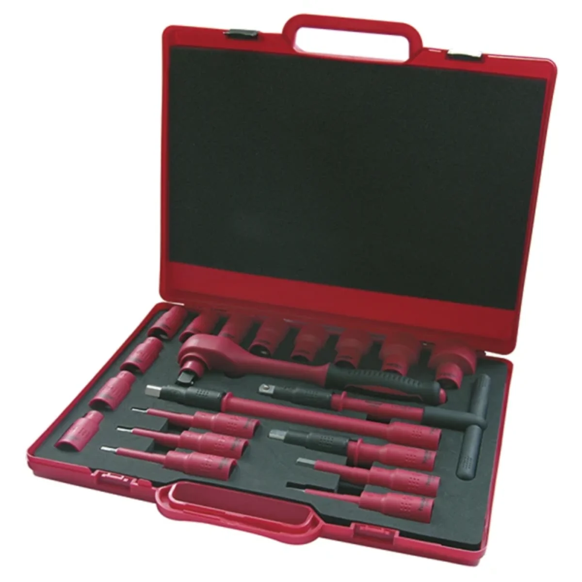 Valigette con cricchetto 1000 V. Valigetta in plastica rivestita in spugna con portautensili da 1/2". Isolamento in materiale resistente agli urti fino a -40°C. C, che consente un funzionamento sicuro a basse temperature. Dimensioni: 380 x 316 x 61 mm. Contenuto:• Cricchetto 250 mm, 1/2"• Chiave a T 200 mm, 1/2"• Prolunghe 125, 250 mm, 1/2"• Set di chiavi a bussola 1/2", 10, 11, 12, 13, 14, 17, 19, 22, 24, 27, 32 mm• Set di chiavi a brugola da 1/2", 4, 5, 6, 8, 10 mm