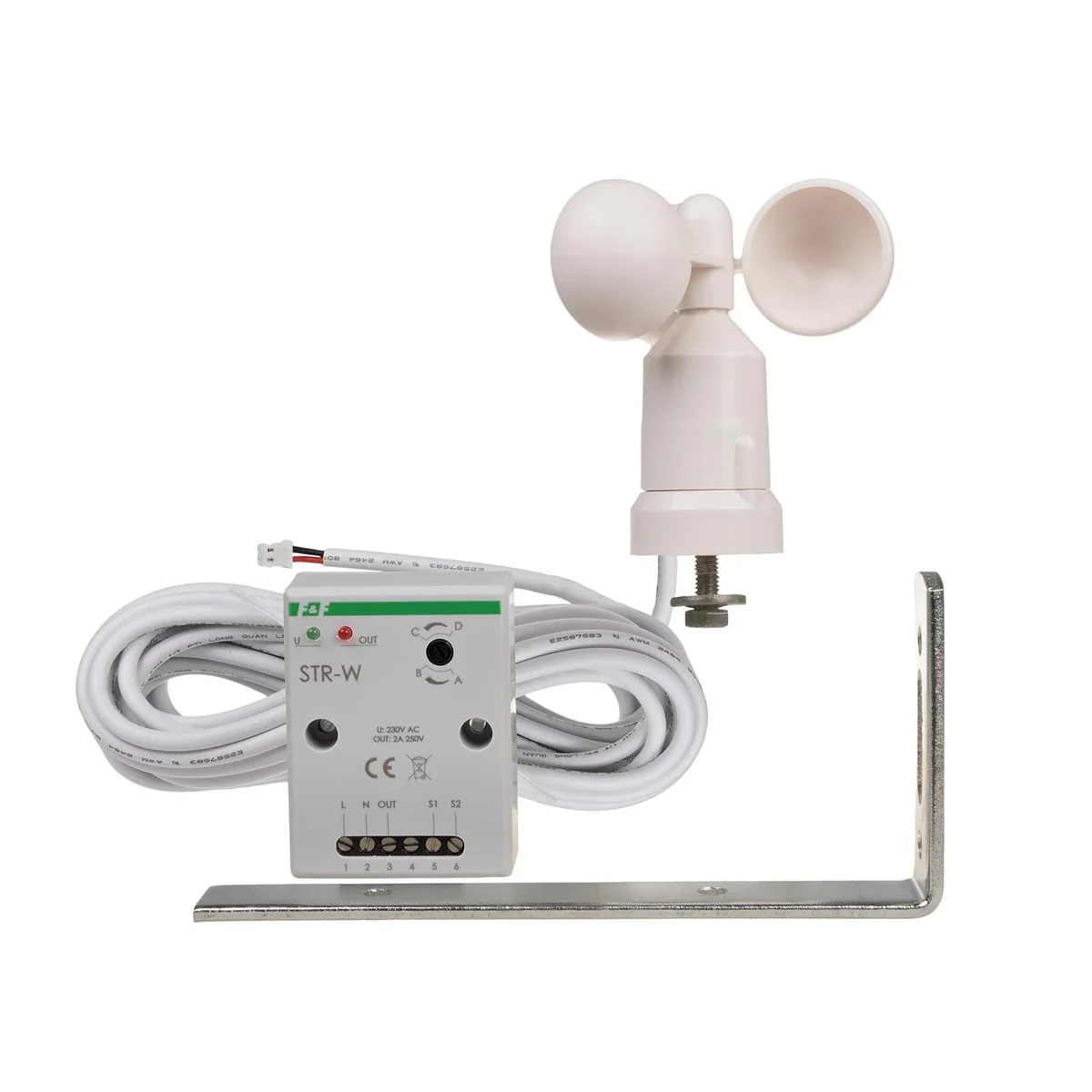 Sterownik STR-W wraz z zewnętrznym czujnikiem wiatru przeznaczony jest do monitorowania aktualnej prędkości wiatru. W przypadku gdy prędkość wiatru przekroczy zadaną wartość progową to nastąpi załączenie wewnętrznego przekaźnika. W połączeniu ze sterownikami rolet STR-3 lub STR-4 umożliwia zbudowanie systemu w którym w przypadku pojawienia się zbyt silnego wiatru zostaną zamknięte rolety okienne lub zwinięte markizy.