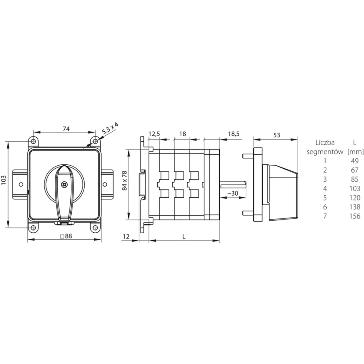 Łącznik krzywkowy 100A, rozłącznik 1-0-2 trójbiegunowy, mocowanie bazo-szynowe czoło szare pokrętło czarne SK100-3.8380\BS03