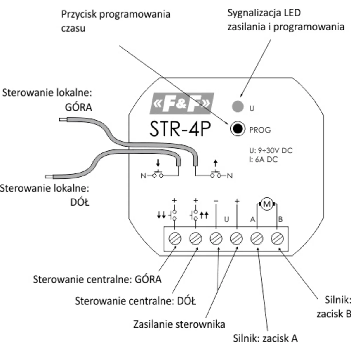 Sterownik STR-4P przeznaczony jest do sterowania rolet (góra-dół) lub innych obiektów (np. bramy) napędzanych silnikiem elektrycznym prądu stałego zasilanego napięciem 12V lub 24V za pomocą włączników chwilowych (np. dzwonkowych).
