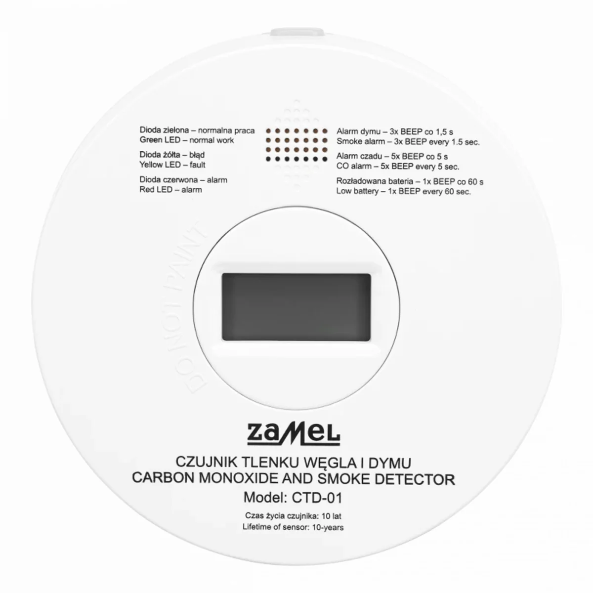 Czujnik CTD-1 służy do ciągłego monitorowania niebezpiecznego stężenia tlenku węgla oraz dymu w powietrzu. Ostrzegając zarówno przed zatruciem czadem jaki i zagrożeniem pożarowym. W momencie wykrycia zagrożenia czujnik uruchamia głośny sygnał dźwiękowy (min. 85 dB) oraz optyczny w postaci migającej diody. Wyposażony jest w precyzyjne i niezawodne czujniki elektrochemiczny i fotoelektryczny o żywotności 10 lat. Znakomitą jego zaletą jest także to, że ma on wbudowaną wydajną baterię litową wystarczającą na cały okres życia czujnika.