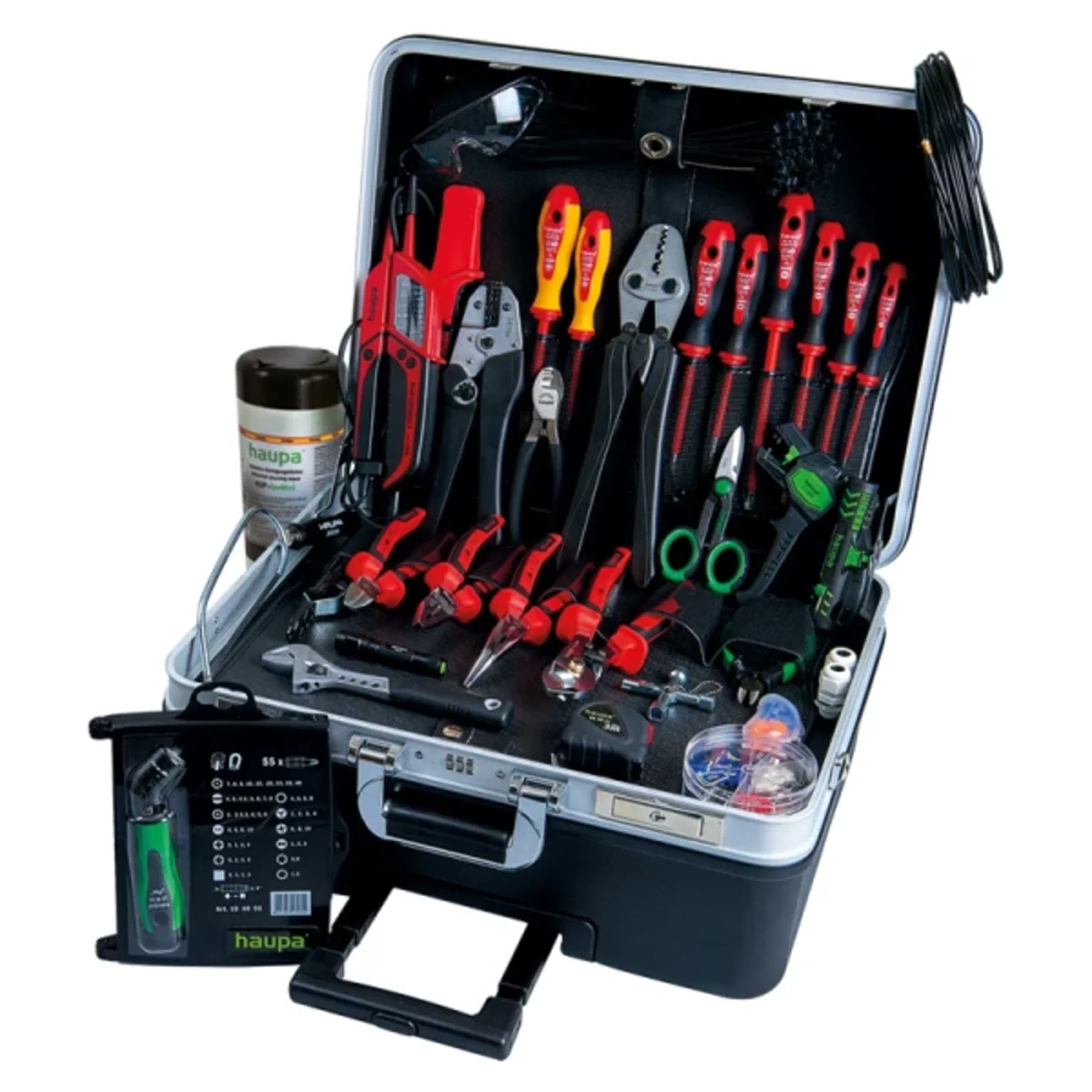 Walizka z twardego tworzywa, czarna, ze stelażem na kółkach, dwa blaty na narzędzia, zamek na kod cyfrowy, aktówka, dno walizki z możliwością dowolnego dzielenia różnorodnymi przegrodami, wyposażona w 38 różnych narzędzi.