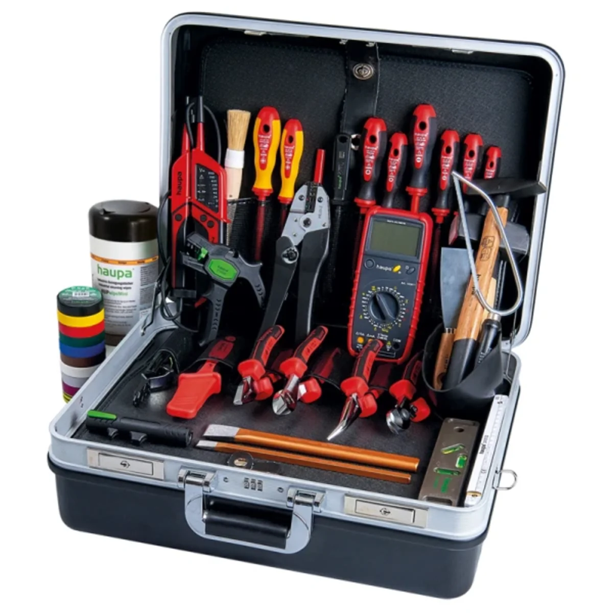 Walizka z twardego tworzywa, czarna, ze stelażem na kółkach, dwa blaty na narzędzia, zamek na kod cyfrowy, z kieszenią na dokumenty, dno walizki z możliwością dowolnego dzielenia różnorodnymi przegrodami, wyposażona w 33 różnych narzędzi. Zawartość:• Zestaw śrubokrętów VDE 2K PZ• Zestaw śrubokrętów VDE 2K PZ/FL 1 + 2• Automatyczny ściągacz izolacji „Super Plus“ 0,2-6 mm?• Ściągacz izolacji z nożem hakowym ? 8 - 28 mm• Wskaźnik napięcia “Basic”• Kombinerki VDE 2K, 185 mm• Mocny obcinak boczny VDE 2C, 205 mm• Szczypce półokrągłe VDE 2C, 200 mm• Ołówek • Młotek ślusarski 300 g• Przecinak dla elektryków 10x250 mm• Piłka “kieszonkowa” „PUK“• Poziomica 225 mm• Miara skladana 2 m• Szpachla malarska 40 mm• Pędzel• Foremka gumowa do rozrabiania gipsu• Nóź do kabli 1000 V• Młotek dwuobuchowy 1000 g• Przecinak kamieniarski płaskoowalny 28x250 mm• Przemysłowe – ścierki do czyszczenia• Praska do zaciskania końcówek widełkowych, oczkowych tulejkowych• Ściągacz izolacji ? 8-13 mm• Obcinak do kabli VDE 170 mm• Zestaw taśm izolacyjnych VDE, 15 mm x 10 m 10 kolorów,Rainbow pack, dostępna w 10 kolorach• Wskaźnik napięcia „Profi LED Plus“• HAUPA „Multi Clamp“ Wysokowydajny cyfrowy miernik uniwersalny