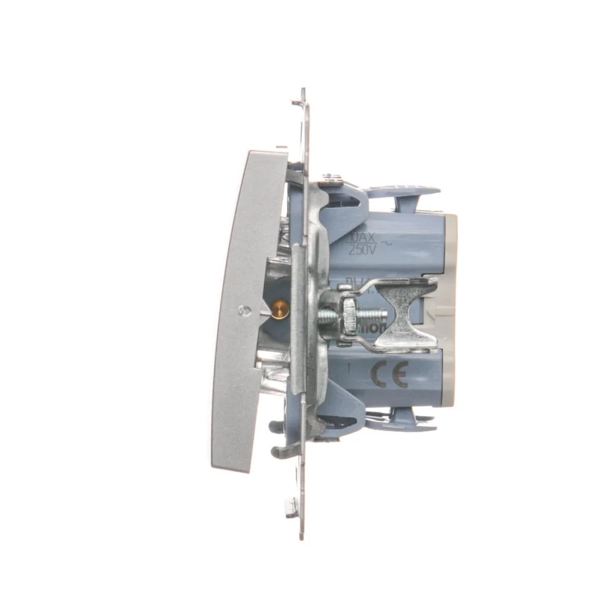 Łącznik jednobiegunowy (bistabilny) z serii Simon 54. Do uzyskania klasy bryzgoszczelności IP44 zastosować uszczelkę ramki.