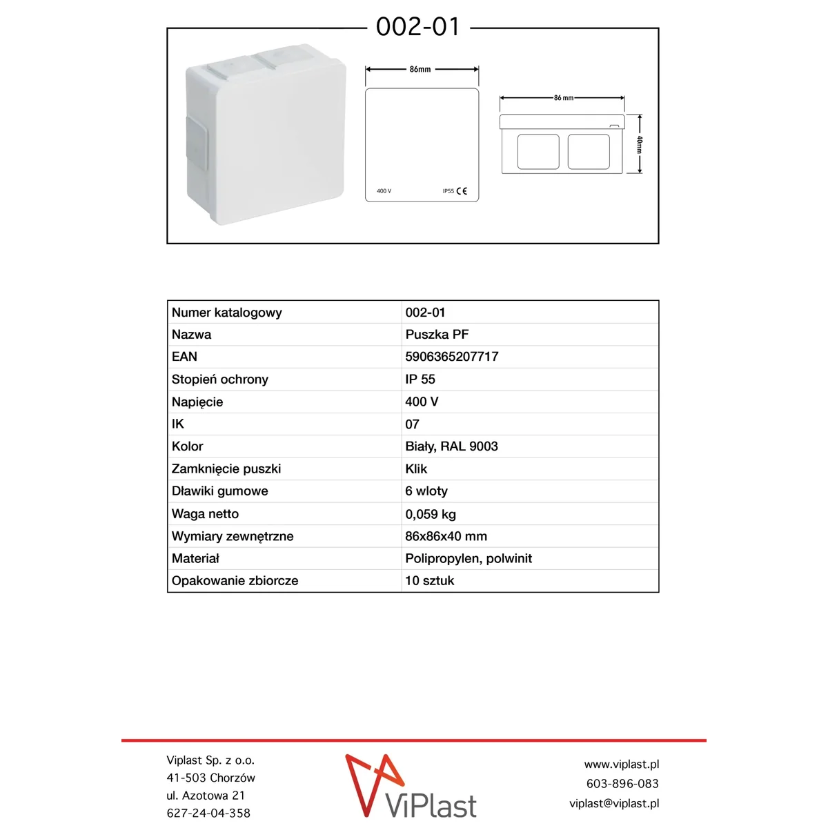 Puszka PF natynkowa, w rozmiarze 86x86x40mm, z zabezpieczeniem IP55, 6-wlotowa z dławnicami gumowymi (bezgwintowymi). Jest wyposażona w dekiel klik-klak. W kolorze białym.