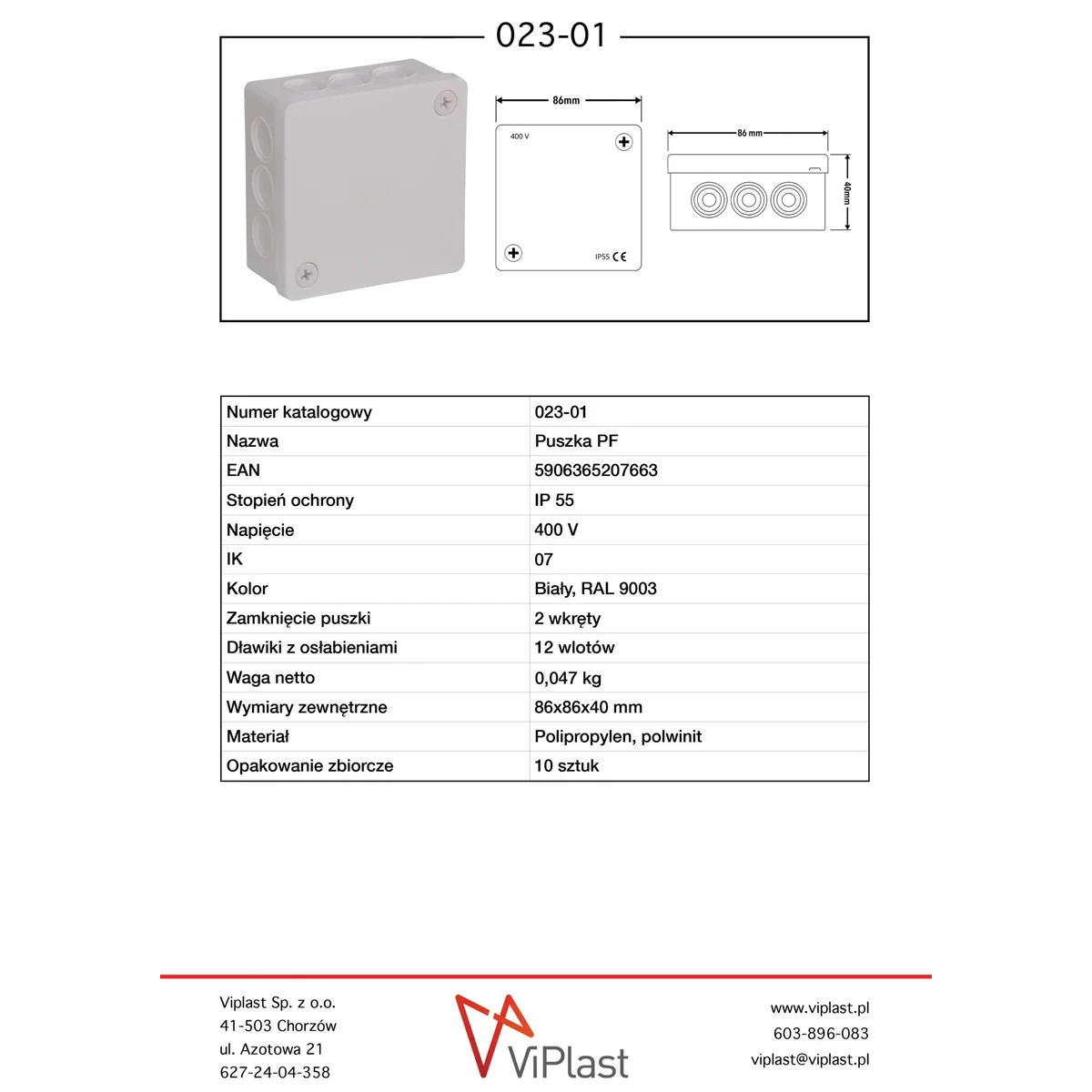 Puszka PF natynkowa, w rozmiarze 86x86x40mm, z zabezpieczeniem IP55, 12-wlotowa z osłabieniami; można zastosować dławnice gwintowe. Jest wyposażona w dekiel na 2 wkręty. W kolorze białym.