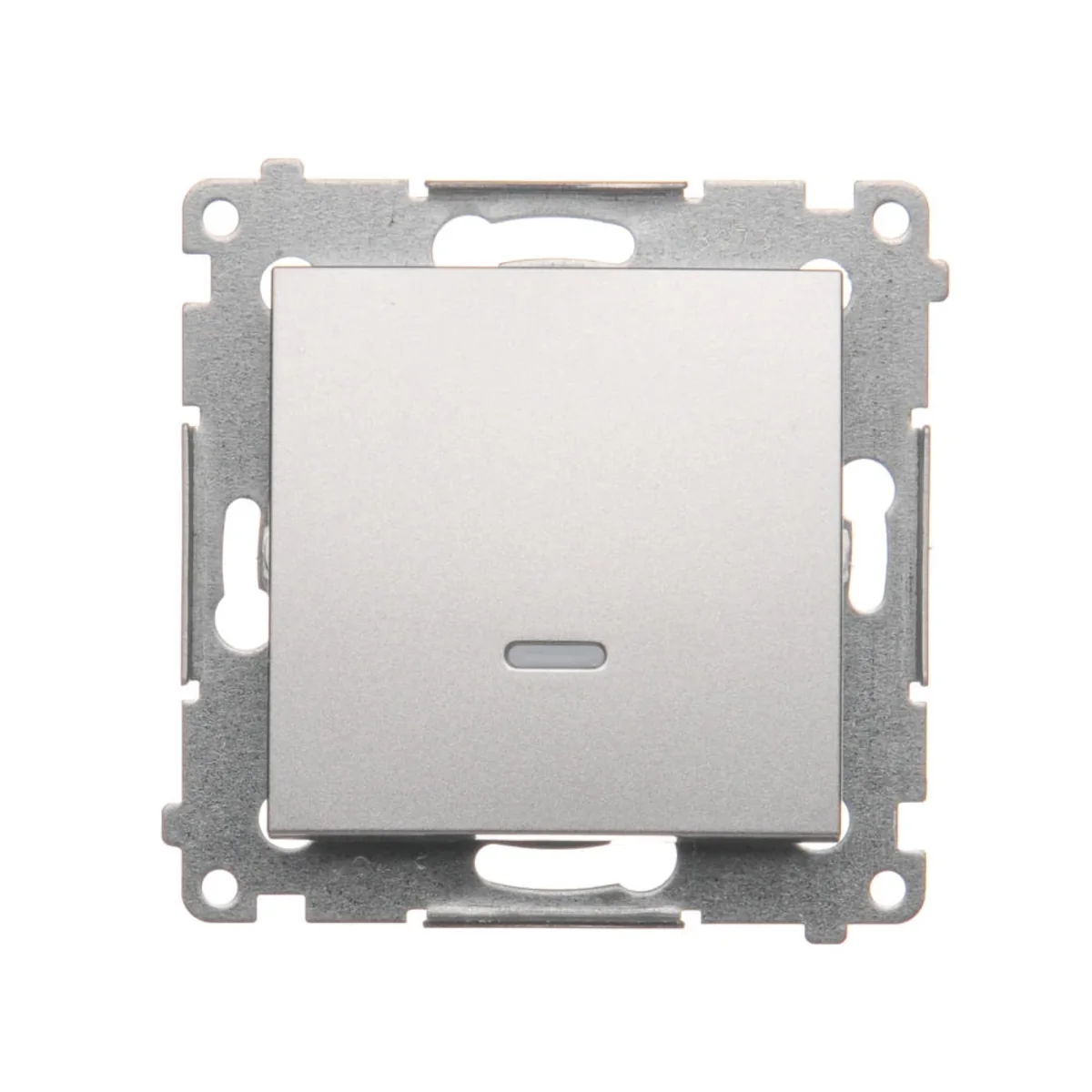 Przycisk zwierny pojedynczy z podświetleniem, z serii Simon 54, od producenta Kontakt Simon. Numer katalogowy produktu to DP1L.01/43. W kolorze srebrny mat, metalizowany.