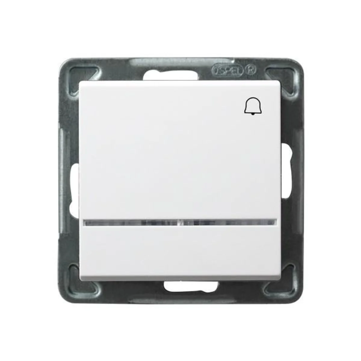 Łącznik zwierny "dzwonek" z podświetleniem, z serii Sonata, od producenta Ospel. Numer katalogowy produktu to ŁP-6RS/M/00. W kolorze białym.
