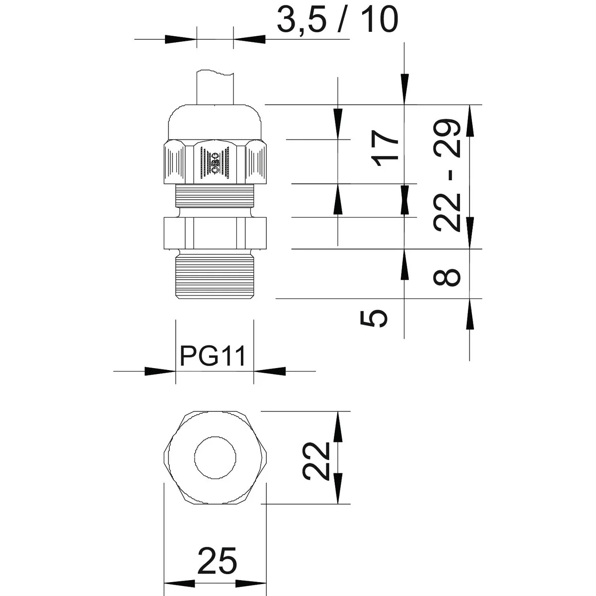 Wytrzymały dławik kablowy z gwintem PG wg DIN 40430 o konstrukcji nakrętki kołpakowej z dużym obszarem uszczelnienia, odciążenie ciągu i zabezpieczenie przed przekręceniem gwarantujące dużą szczelność. Pierścień uszczelniający z chloroprenu/kauczuku nitrylowego, natryskiwane żebra uszczelki, brak konieczności zastosowania pierścienia uszczelniającego gwint, atest VDE 0619, stopień ochrony IP68 przy 5 bar/1 h.