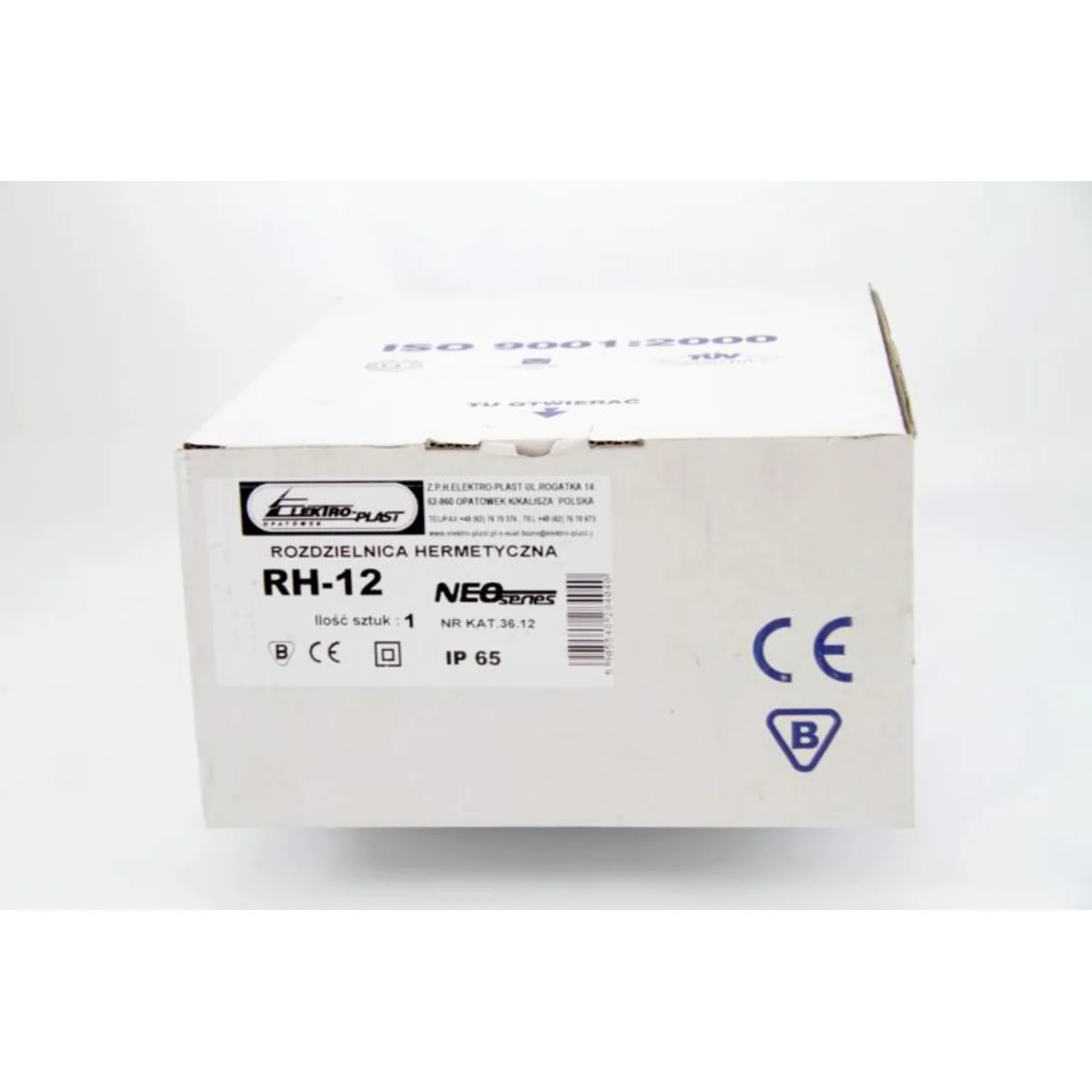 Rozdzielnica hermet. RH-12. Rozdzielnice hermetyczne serii RH "NEO" przeznaczone są do użytku domowego i przemysłowego z możliwością instalacji wyłączników nadmiarowo prądowych oraz aparatów elektrycznych . Występują w wersji natynkowej i znajdują szerokie zastosowanie w instalacjach wykonywanych na zewnątrz budynków. Charakterystyka techniczna:rozdzielnice wyposażone w przezroczyste przyciemniane drzwiczki otwierane na bok (na lewo lub na prawo), przystosowane do zamontowania zamka na klucz, dostępne w kolorze białym, wykonane z wysokiej jakości tworzywa >ABS< odpornego na wysoką temperaturę do 960oC (próba rozżarzonym prętem- dotyczy listwy zaciskowej), stabilność pracy od -25oC do +60oC, odporność na uderzenia (stopień IK 07), możliwość zainstalowania aparatów o głębokości 68 i 75mm, modele 12 modułowe i większe wyposażone w osłabienia w ściankach dla przepustów kablowych i rurek instalacyjnych, możliwość plombowania drzwiczek, rozdzielnice wyposażone:w listwy zaciskowe dla torów N i PE, wspornik montażowy TH 35, etykietę samoprzylepną do opisów.