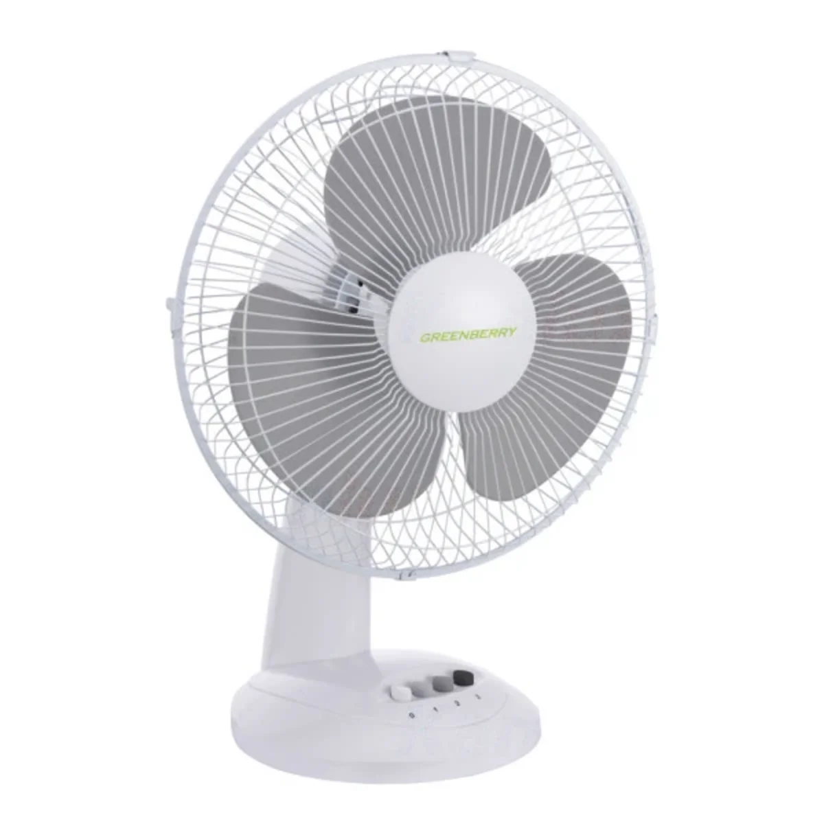 Wentylator biurkowy firmy KANLUX w kolorze białym o mocy 40W i średnicy "30.Posiada 3 stopnie prędkości wiatraka.Szerokość podstawy wynosi 200mm.