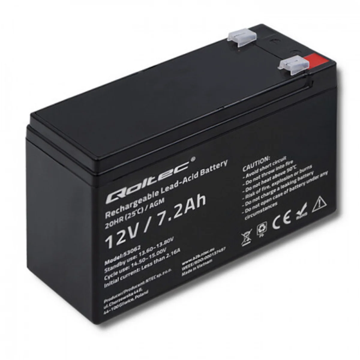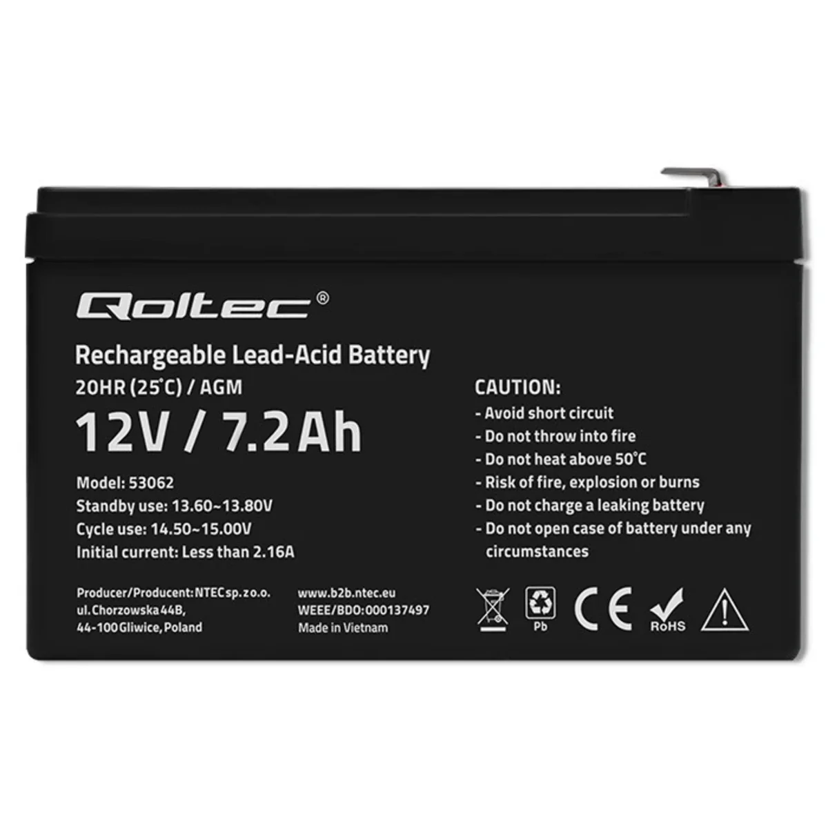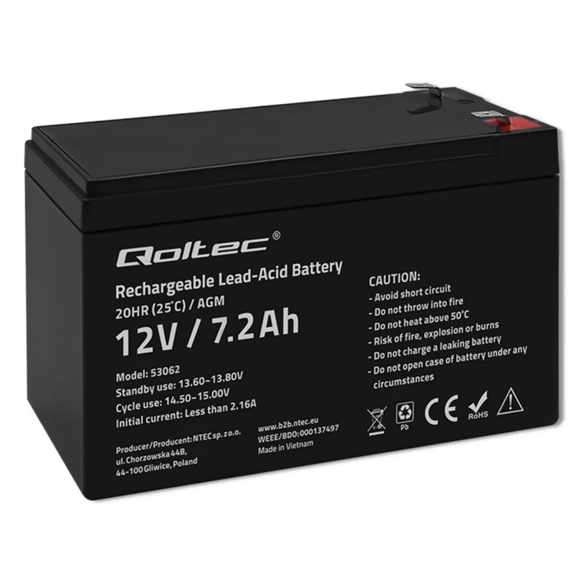 Akumulator AGM od producenta Qoltec. Numer katalogowy produktu to 53062. Przeznaczony jest do zastosowań w systemach zasilania awaryjnego oraz w innych sytuacjach, w których akumulator pracuje cyklicznie.