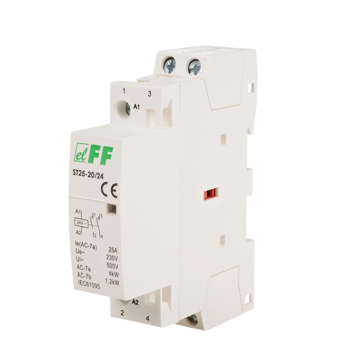 Електромагнітні контактори в модульних корпусах для прямого монтажу на рейку 35 мм. Подача напруги живлення на котушку контактора призведе до перемикання контакту. Статус активації контактора позначається червоним маркером у вікні. Після відключення живлення контакти повертаються у вихідне положення.
