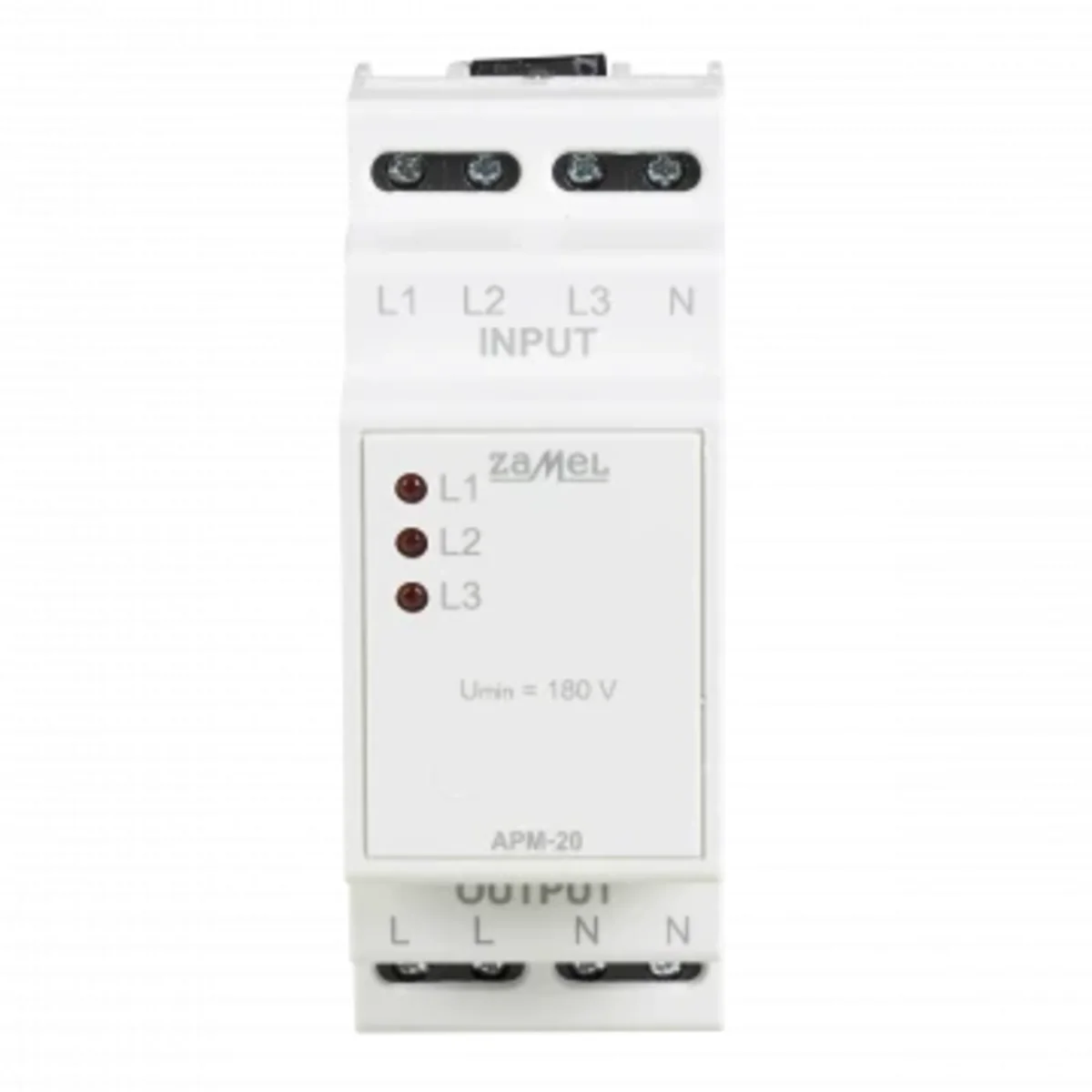 Автоматичний перемикач фаз APM-20 – це пристрій, основною функцією якого є підтримка безперервності живлення однофазних навантажень у разі втрати фази або падіння напруги нижче заданого значення. Головною перевагою пристрою є низька відносна похибка вимірювання напруги, яка не перевищує 1% навіть для сильно спотворених форм сигналу. Це досягається завдяки програмній реалізації перетворювача True RMS. APM-20 живиться від трьох фаз: L1, L2 та L3, де L1 є пріоритетною фазою. Поріг перемикання напруги (180 В змінного струму), час перемикання (150 мс) та гістерезис напруги (10 В змінного струму) встановлені на заводі та не можуть бути змінені користувачем. Світлодіоди на передній панелі забезпечують візуальну індикацію параметрів кожної фази. Внутрішня система вихідних контактів забезпечує підвищену стійкість до залипання контактів та захищає від міжфазних коротких замикань. Максимальний вихідний струм не повинен перевищувати 16 А для навантажень класу AC1. APM-20 призначений для встановлення в розподільних щитах (TH-35). Корпус має ширину 2 модулі.