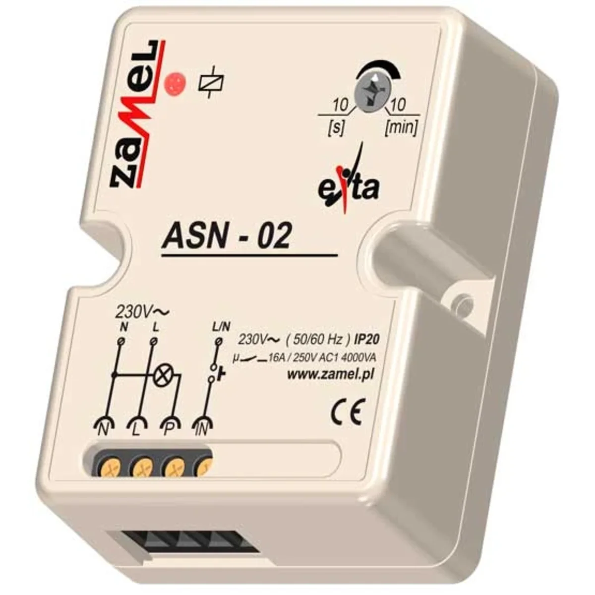 Сходовий автоматичний вимикач АСН-02 використовується для управління освітленням в коридорах або на сходах. Після спрацьовування система включає освітлення на заданий користувачем час з наступним автоматичним відключенням. Час роботи можна плавно регулювати в діапазоні від 10 с до 14 хвилин за допомогою потенціометра, розташованого на передній панелі машини. Машина оснащена функцією антиблокування. Сходовий автоматичний вимикач ASN-02 також може використовуватися як реле часу з функцією відстрочки відключення. Накладний корпус дозволяє встановлювати на рівні поверхні.
