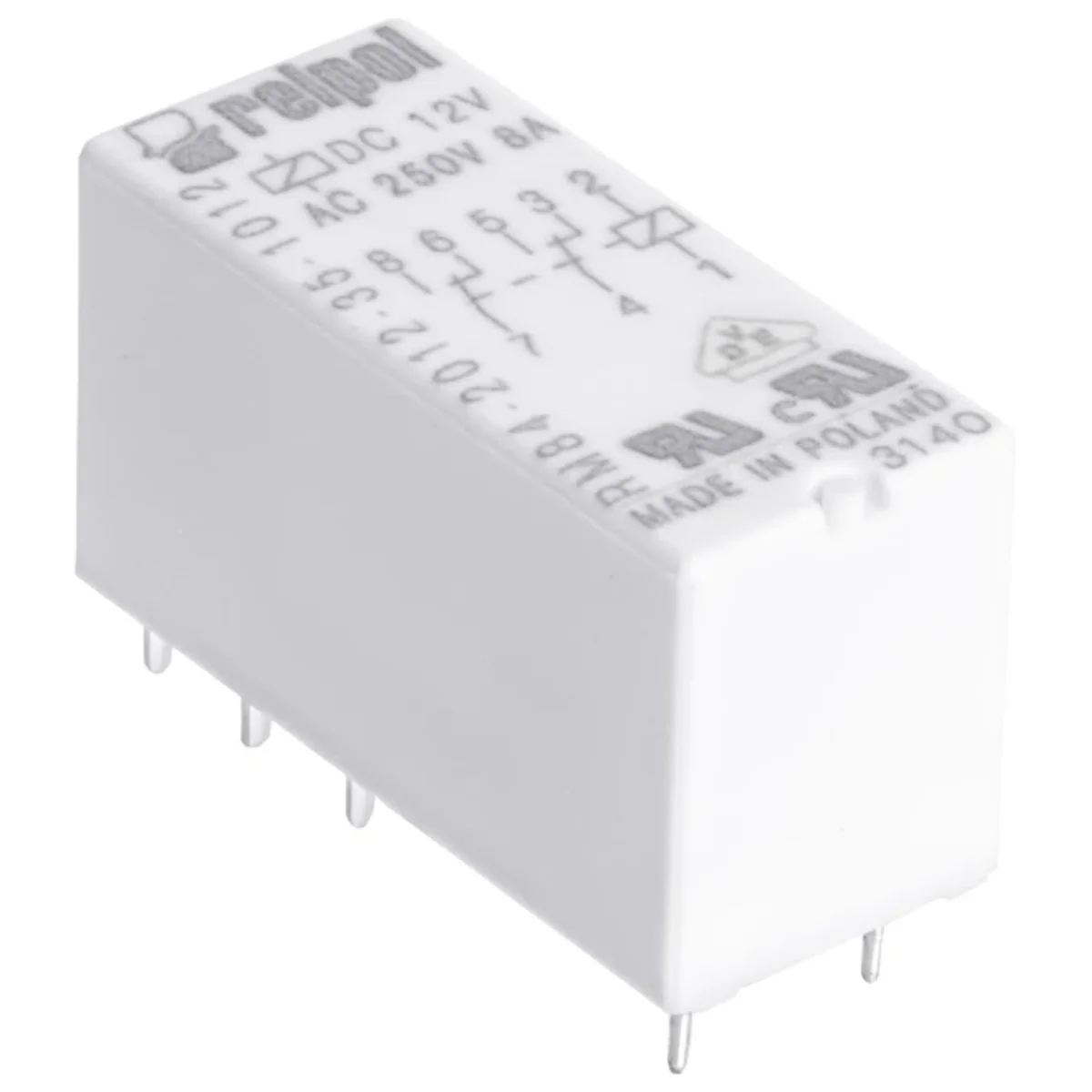 Реле електромагнітне мініатюрне для друкованої плати та розетки. Крок 5 мм. Висота 15,7 мм. Вихід: 2P - два перекидних контакти - клеми: 11(7)-12(6)-14(8); 21(4)-22(3)-24(5); AC1 - 8A / 250V; DC1 - 8 A / 24 V. Вхід / котушка - клеми: A1(1) - A2(2), напруга живлення Un - 3 V DC. Розміри: 29 x 12,7 x 15,7 мм. Матеріал контакту: AgNi. IP 67. Варіанти монтажу розеток: EC50, GD50, PW80 - для друку; GZP80 (вставний), GZT80, GZM80, GZS80, GZF80 - кріплення на рейку 35 мм або прикручування до панелі одним гвинтом М3; GZMB80 - безгвинтова розетка для монтажу на рейку 35 мм. Розміри комплекту реле + розетка + затискачі вказані в описі обраної розетки.