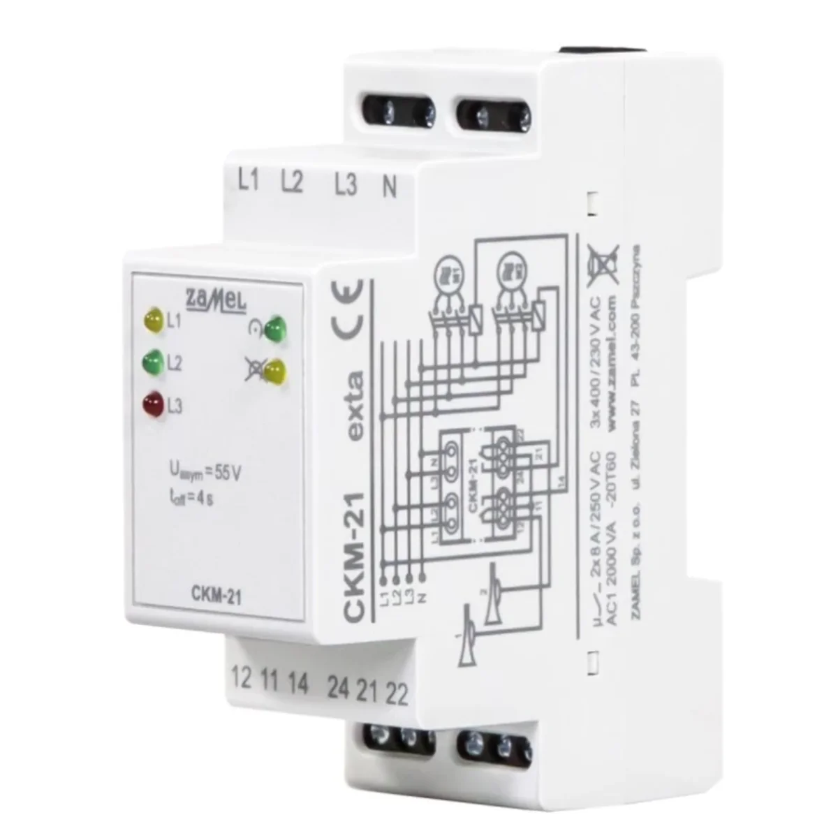 Датчик послідовності фаз CKM-21 використовується для захисту пристроїв, що живляться від трифазної мережі (наприклад, двигунів), від пошкоджень у разі втрати фазної напруги, асиметрії фазної напруги або неправильної послідовності фаз. Поріг асиметрії заводським способом встановлено на 55 В. Датчик також захищає від симетричних падінь напруги, відключаючи реле, якщо напруга на будь-якій фазі падає нижче 150 В (незалежно від рівня асиметрії). Пристрій живиться від будь-якої фази, тобто напруги на одній фазі достатньо для повної функціональності. 4-секундна затримка вимкнення та гістерезис напруги роблять датчик стійким до короткочасних коливань напруги. CKM-21 має два канали, що працюють паралельно.