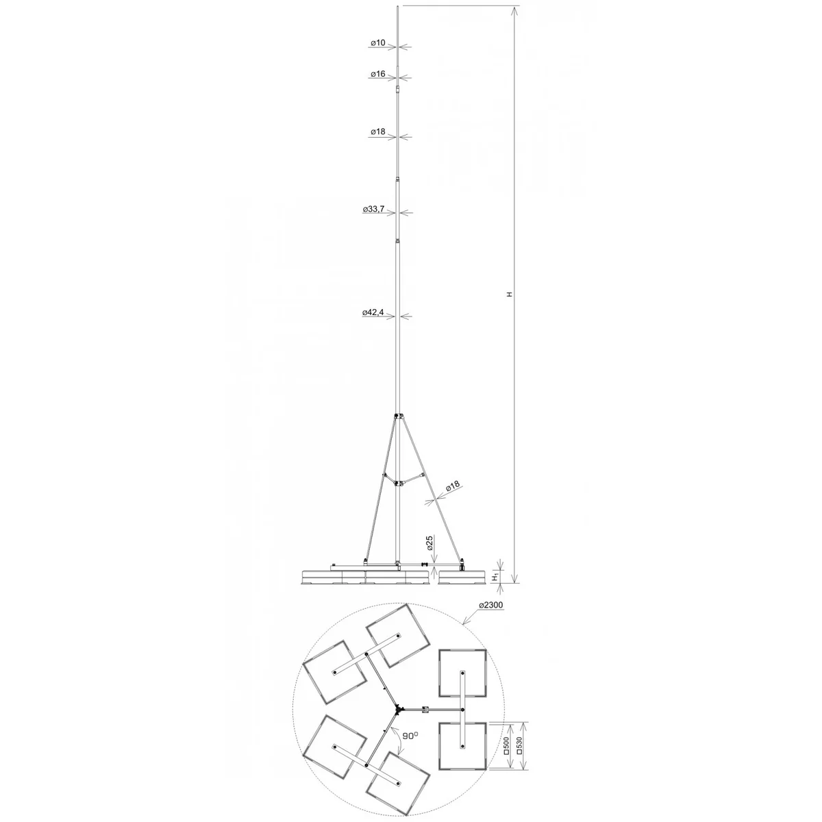 Окремо стоячі блискавкозахистні щогли на потрійній вазі (trójn&oacu;g) створюють захищений простір. Вони не вимагають склеювання. Пропонується в комплекті з аксесуарами: ПВХ підкладки для бетонних тягарів, гирі, опори, шпиль, з'єднувач для з'єднання щогли з пневматичною сіткою. РЕКОМЕНДУЄМО: Застосування шурупів AN-81R, основа щогли - тринога до 6°.