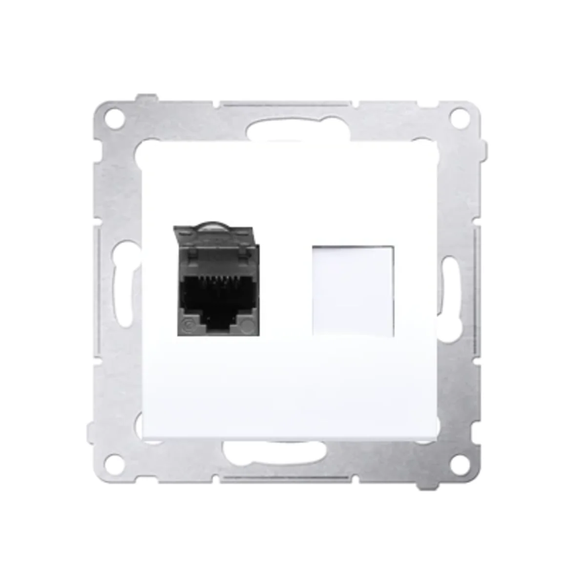 Комп'ютерна розетка одинарна екранована RJ45, категорія 6, з пилозахисною кришкою, серія SIMON 54. Виготовлений із пластику. З обжимом для проколювання ізоляції.