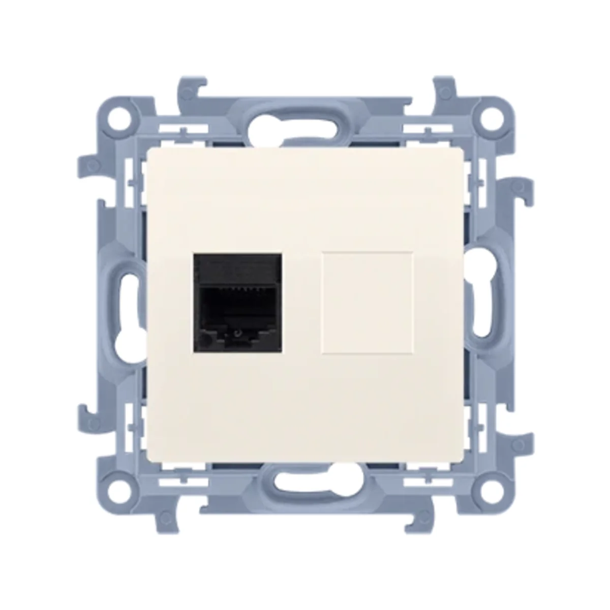 Комп'ютерна одинарна розетка RJ45 категорії 5e, кремового кольору. Він був виготовлений із пластику. Тип проколу ізоляції. Розетка належить до SIMON 10, економічної модульної серії для інвестицій, де не потрібні різні кольори. Відмінною рисою цієї серії є непровідний міст із високоякісного пластику, що забезпечує довговічність і гнучкість, а також безпеку під час монтажних робіт.