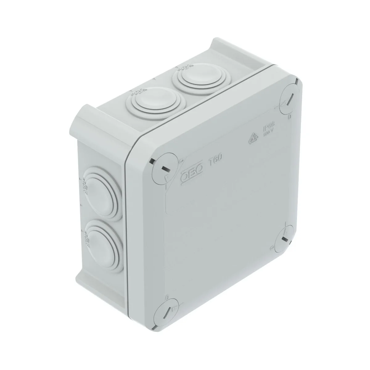 Розподільні коробки виготовлено з поліпропілену, термопластику, а 7 гнучких вводів M25 виготовлено з етиленвінілацетату ( EVA). Завдяки цьому кабелі можна встановлювати, безпосередньо проколюючи гнучкі вводи кабелем, або гнучкі вводи можна розрізати ножем, щоб зробити отвір для введення кабелів або труб. Крім того, замість гнучких сальників можна встановити кабельні сальники, які потім закріплюються зсередини контргайкою. Розподільні коробки можна закріпити на монтажних пластинах за допомогою гвинтів для листового металу 3,5 x 9,5. Внутрішні розміри: 100 x 100 x 48 мм. Кришки з полем опису, запечатані.