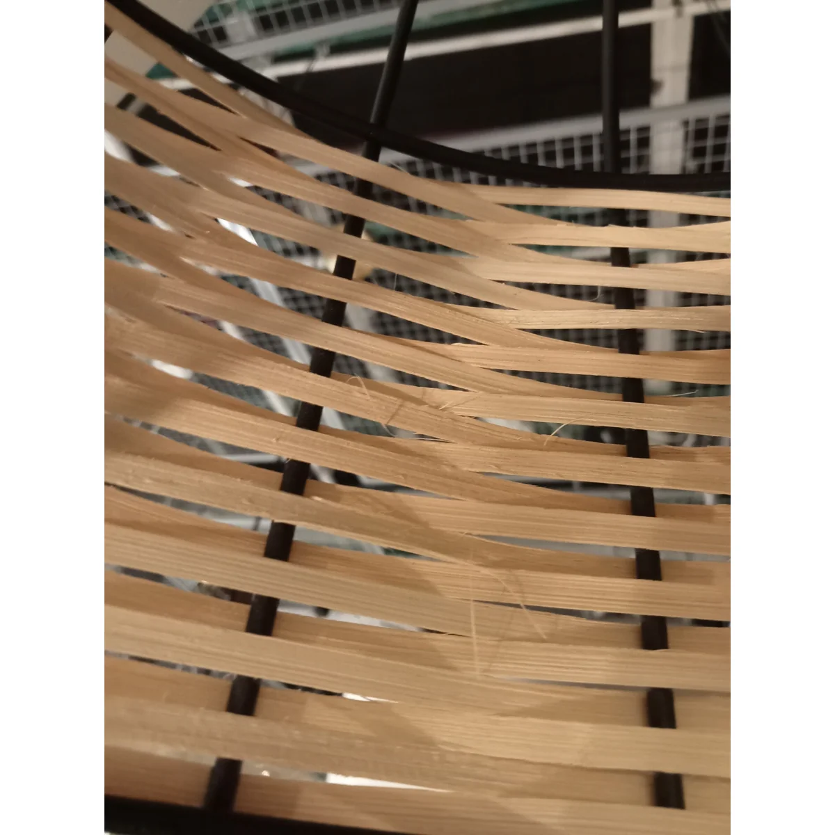 Підвісна лампа ANWICK має абажур з чорним металевим каркасом і смугами з натурального ротанга.
