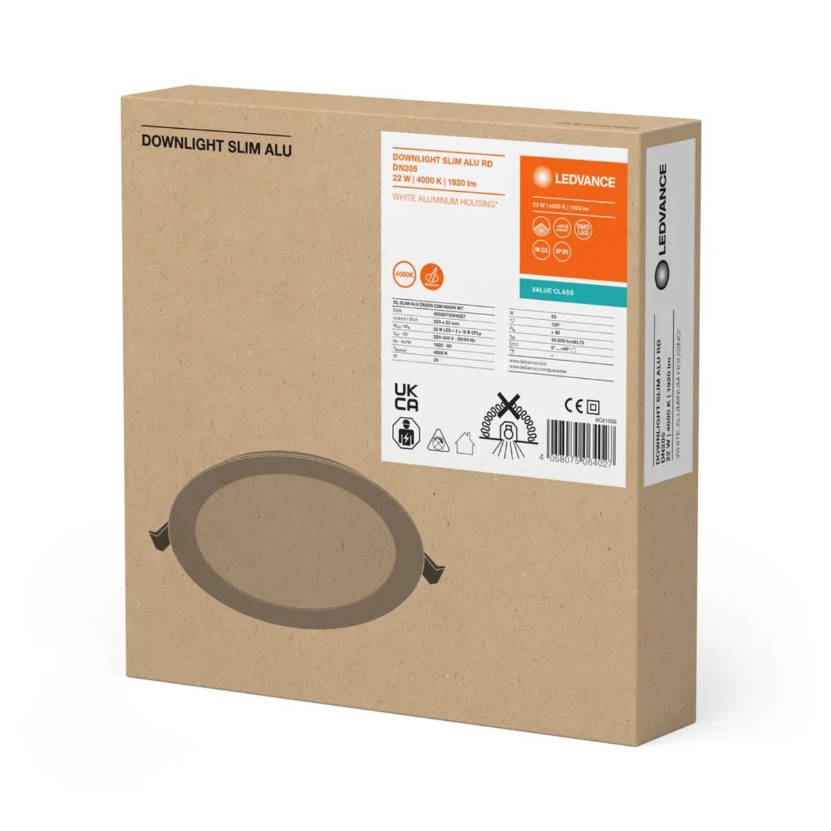 DOWNLIGHT SLIM LED настінно-стельовий світильник 230V 22W 1920lm IP20 p/t NW 205 мм білий 4058075064027