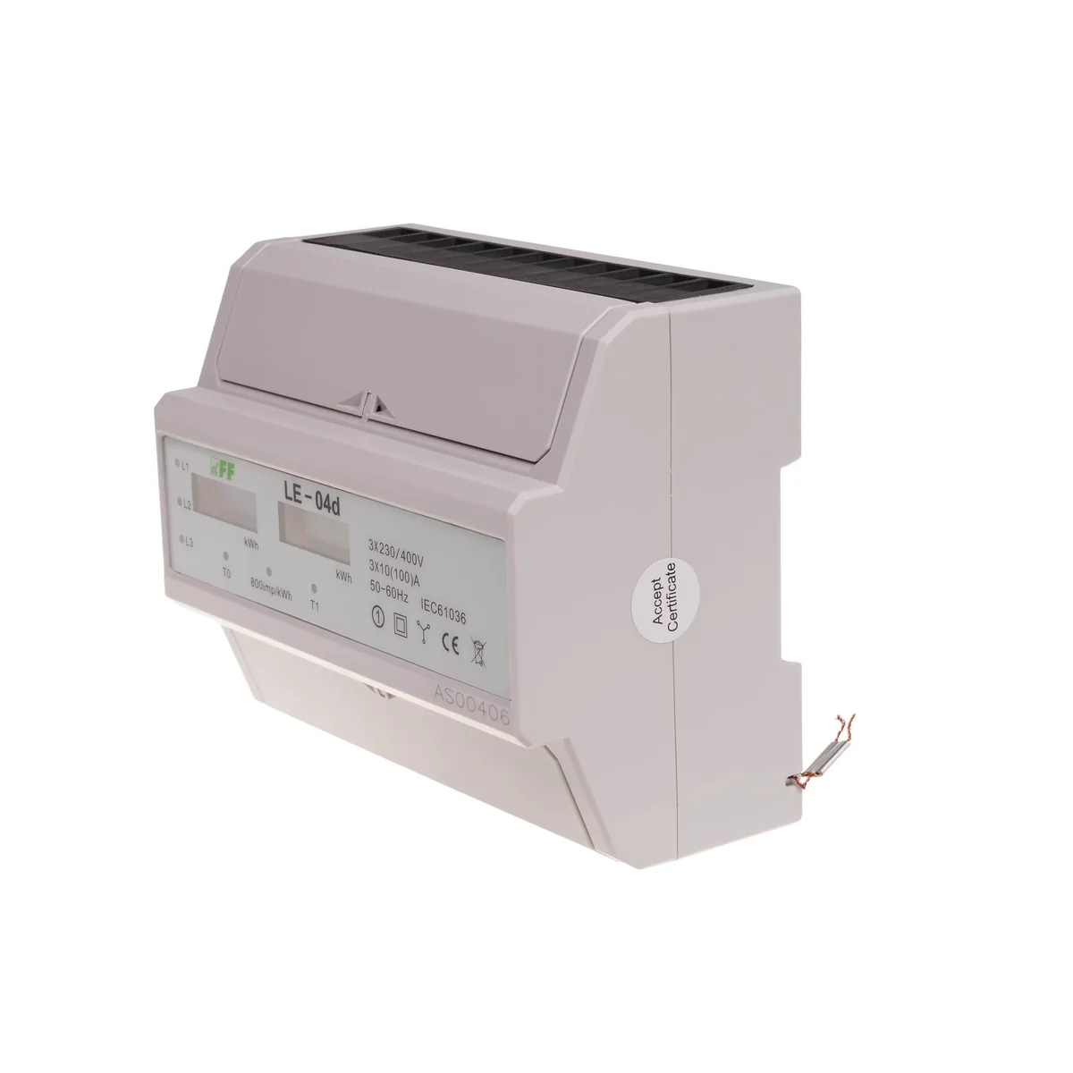 LE-04d - це статичний (електронний) калібрований лічильник електроенергії, який використовується як суб-лічильник для вимірювання електроенергії трифазного змінного струму в прямій системі. Лічильник адаптований для роботи із зовнішнім контрольним годинником і призначений для вимірювання та розрахунку в двотарифній системі.< tr>